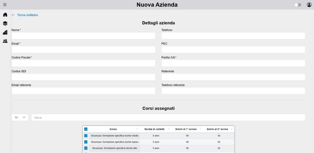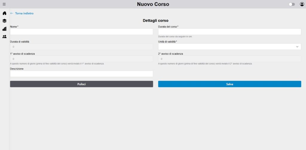 Crea con semplicità nuovi corsi inserendo “Durata del corso”, “Durata di validità” e i 2 “Avvisi di scadenza” che genereranno due allert di scadenza sia per te che per il tuo cliente.