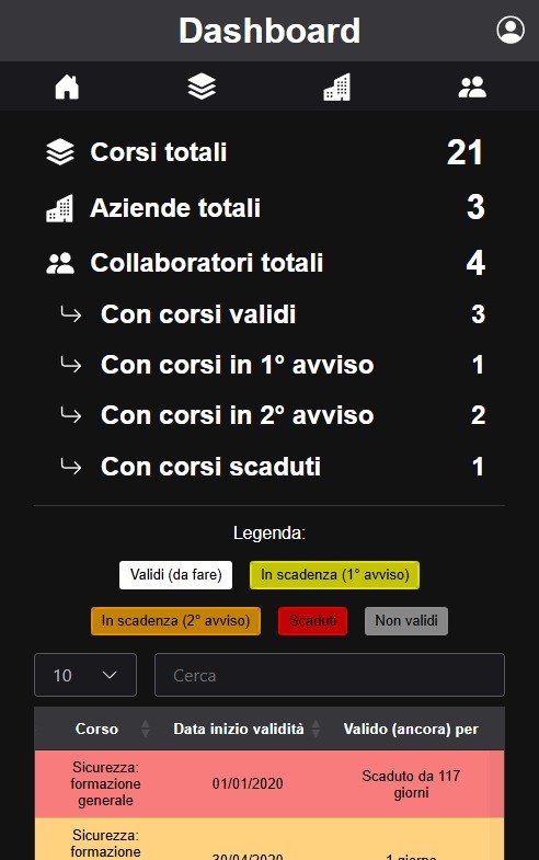 Consultabile da web e da smartphone, l'interfaccia è semplice e intuitiva ti permetterà di controllare agilmente Aziende e Collaboratori e le scadenze corsi..